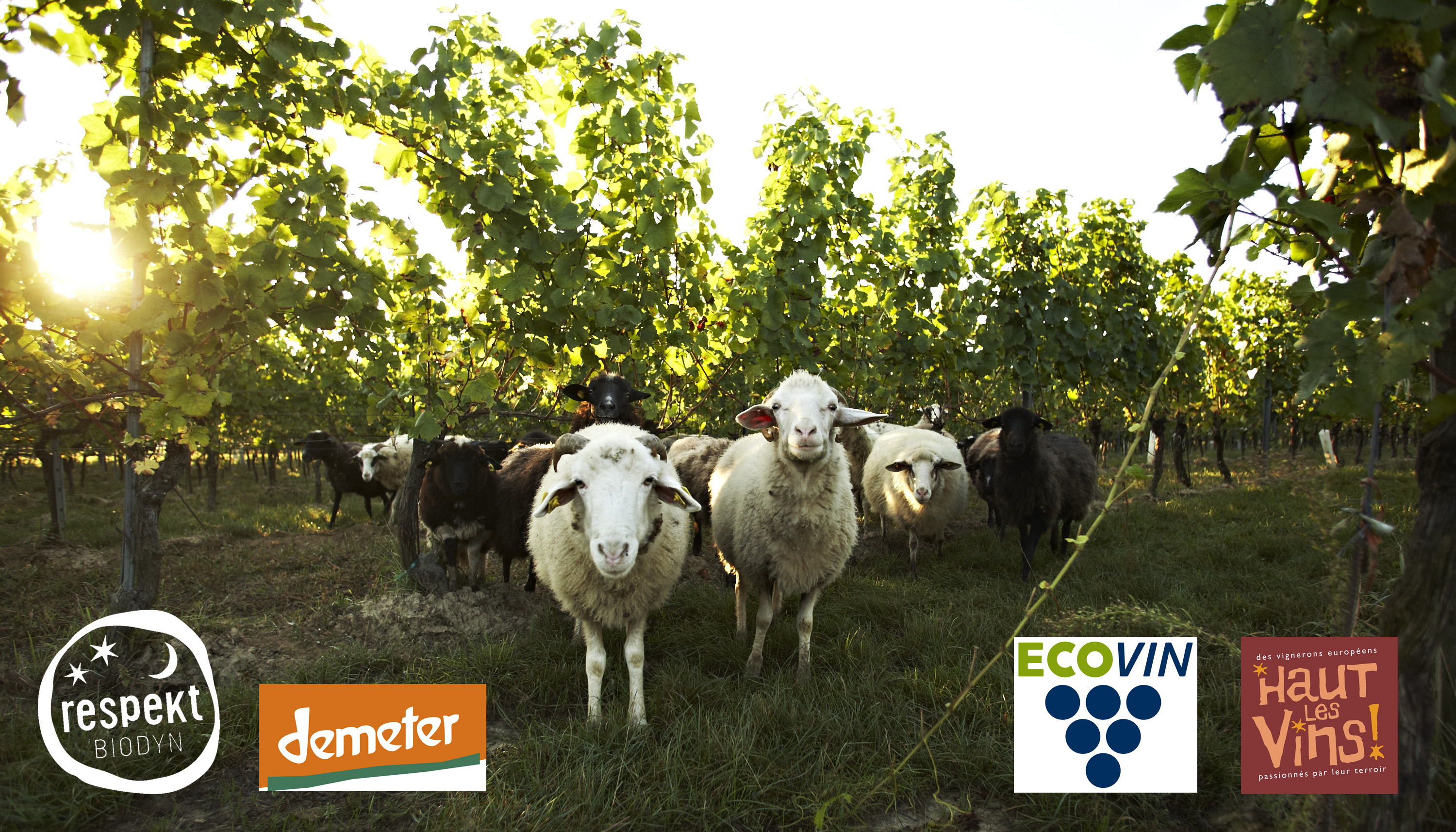 Schafe im Weingarten mit den Logos der vier Winzervereinigungen/Sheeps in a vineyard and the logos of the associations