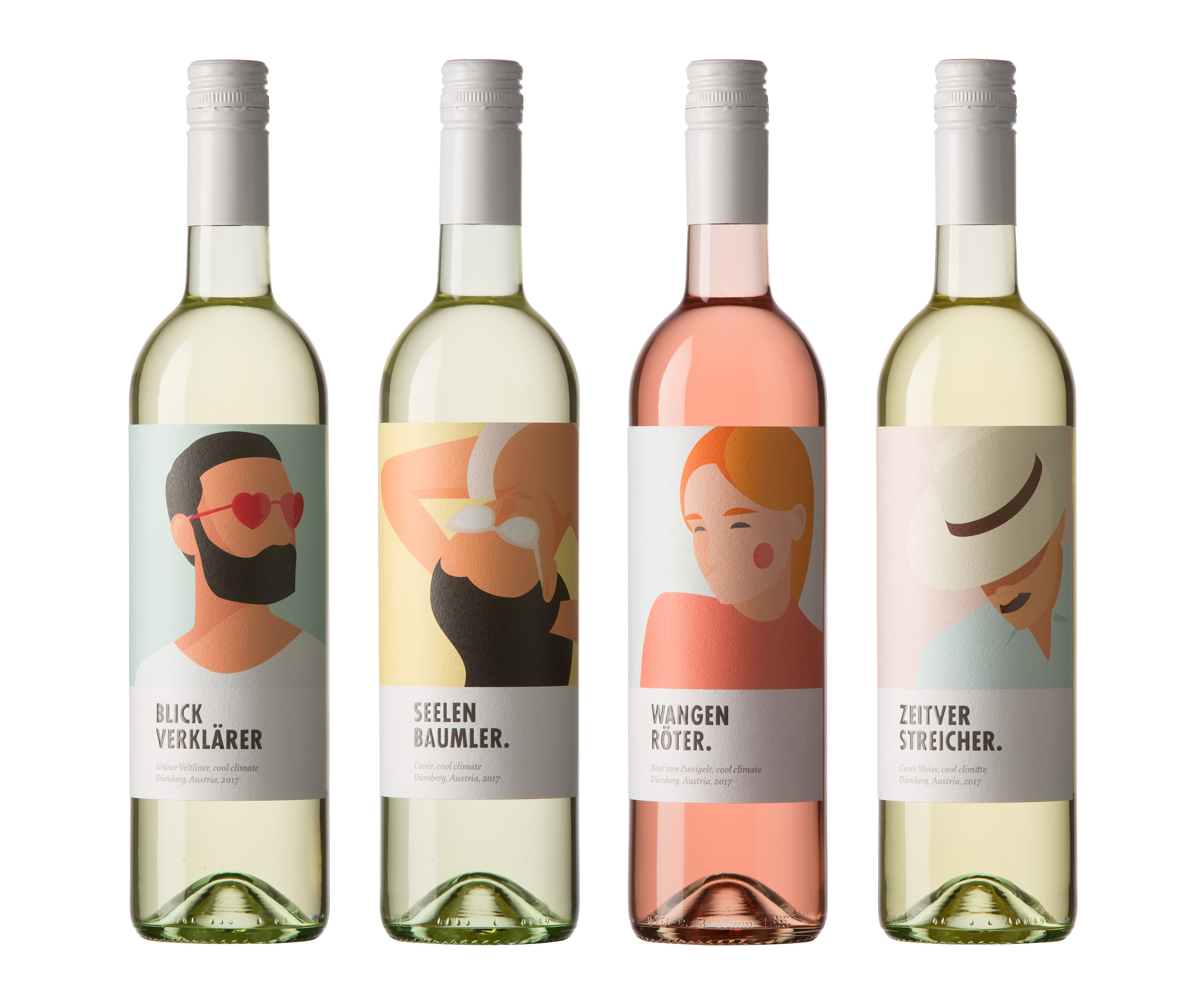 Die vier Weine der Sonderedition Trinkvergnügen vom Weingut Dürnberg: Blickverklärer, Sellenbaumler, Wangenröter, Zeitverstreicher