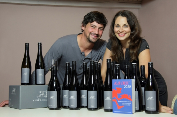 Manfred und Marion Ebner-Ebenauer mit Weinflaschen und dem Guide A la Carte