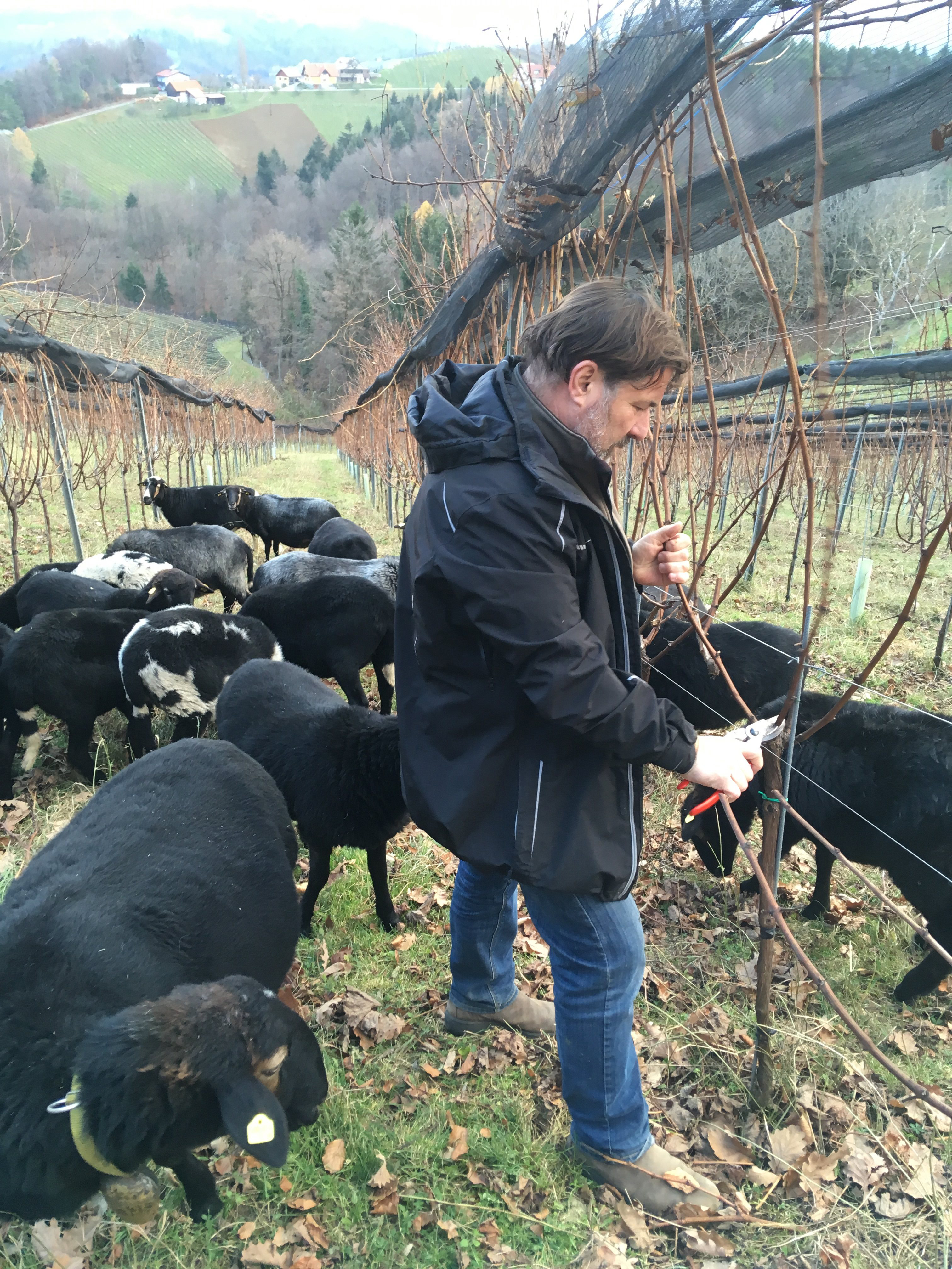 Willi Sattler mit seinen Schafen beim Rebschnitt
