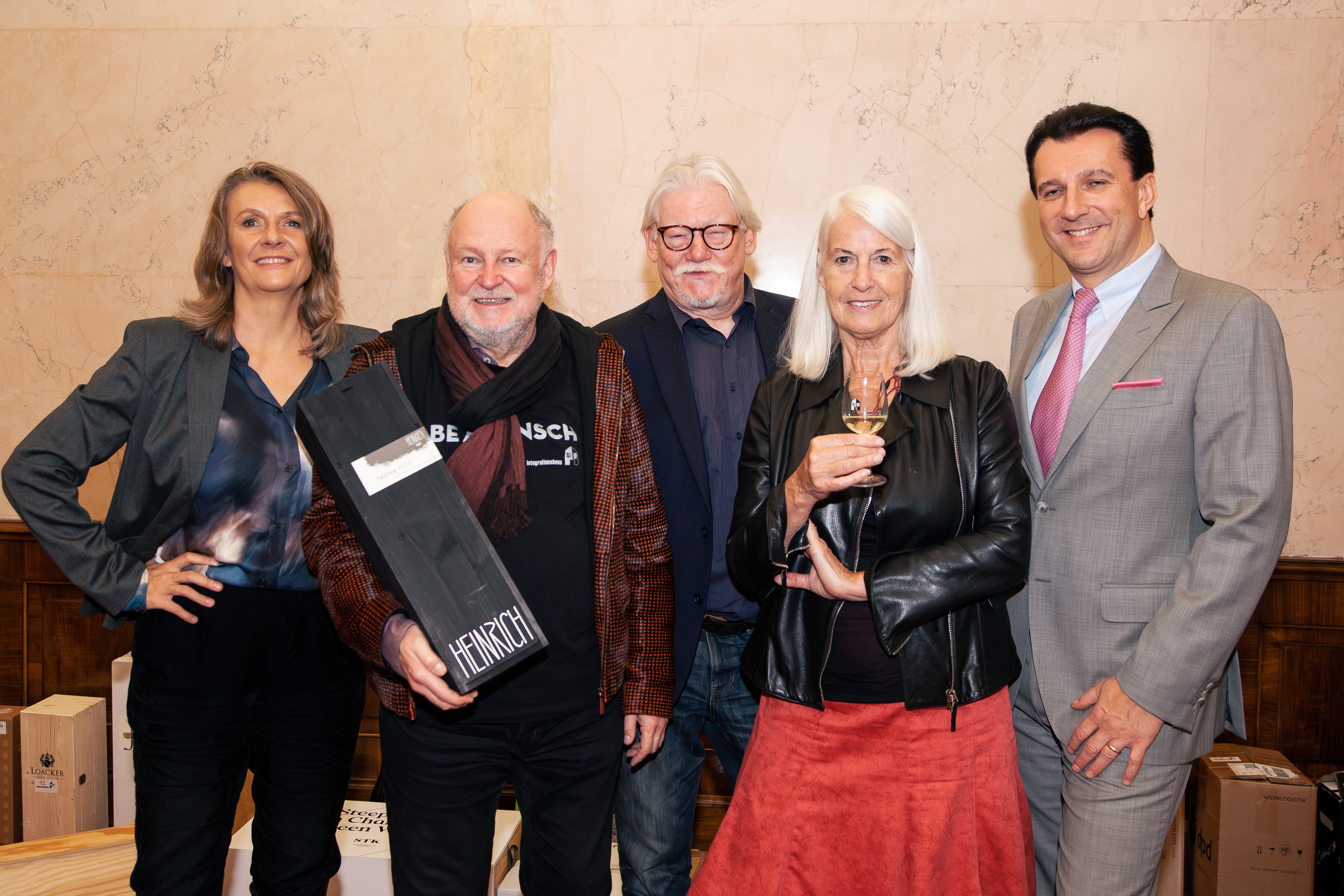 Birgit Denk (Moderation), Sepp Stranig (Vorstand Integrationshaus), Helmut Knall (Moderation), Beatrix Neundlinger (Vorständin Integrationshaus), Matthew Hagerty (Auktionar 2022) v.l.n.r.